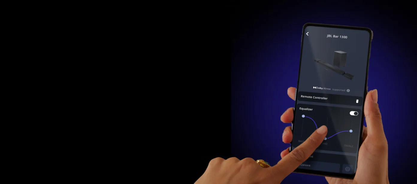 Personaliza el sonido como más te guste, desde tu teléfono. La aplicación JBL ONE es la forma perfecta de añadir una nueva dimensión a tu experiencia de sonido diaria. Personaliza los niveles de ecualización para lograr un sonido perfecto para ti y tu habitación, transmite tu lista de reproducción con pistas y canciones procedentes de más de 300 servicios de música diferentes y mucho más.
